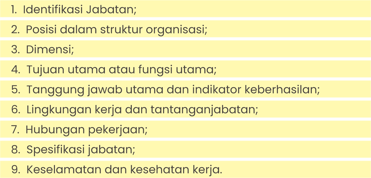Sehingga saya menyarankan lebih baik menggunakan pendekatan legal yang telah mengatur item-item jobdes. Item-item jobdes yang diatur dalam Permen 1 tahun 2017 sebagaimana dimaksud adalah :